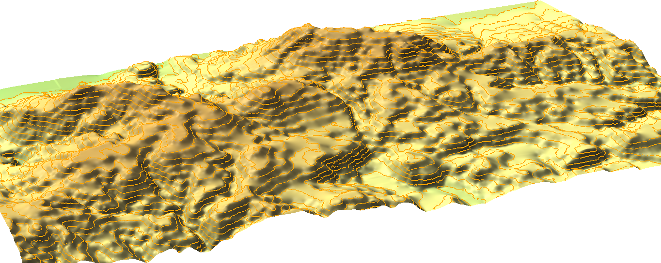 Appendix 1.9: Interpolated surface from contour lines visualized in 3D with the contour lines displayed on the interpolated surface: