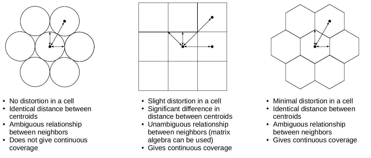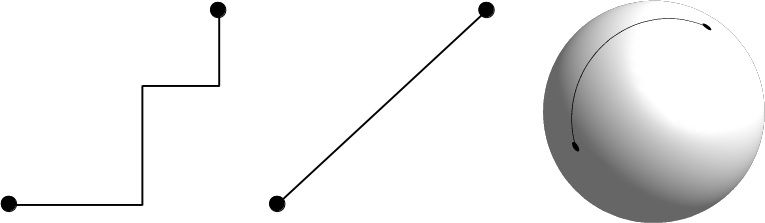 Appendix 1.12: Three popular distance types in GIS. In the Manhattan distance (left), we can go only in one dimension at a time; in the euclidean distance (center), we can move in two dimensions at a time; while in the case of the great-circle distance (right), we can move in three dimensions at a time, but only on the surface of a sphere. Note that the Manhattan distance between the same pair of points does not change, no matter how many breaks (turns) we use: