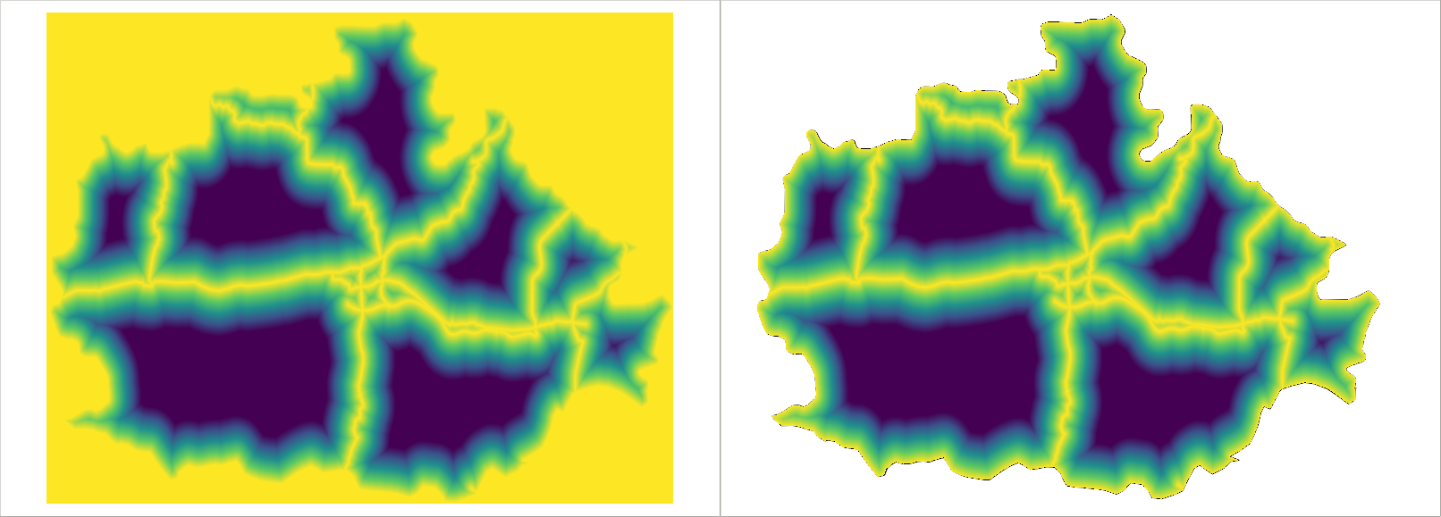 Appendix 1.13: Using clipped layers with NoData values in GDAL's Proximity tool introducing edge effects (left). NoData values are reclassified to zeroes, which wouldn't be a problem; however, distances are calculated from the edges, like they were features. It does not matter if we clip the distance matrix again (right), the edge effects are already introduced to the analysis: