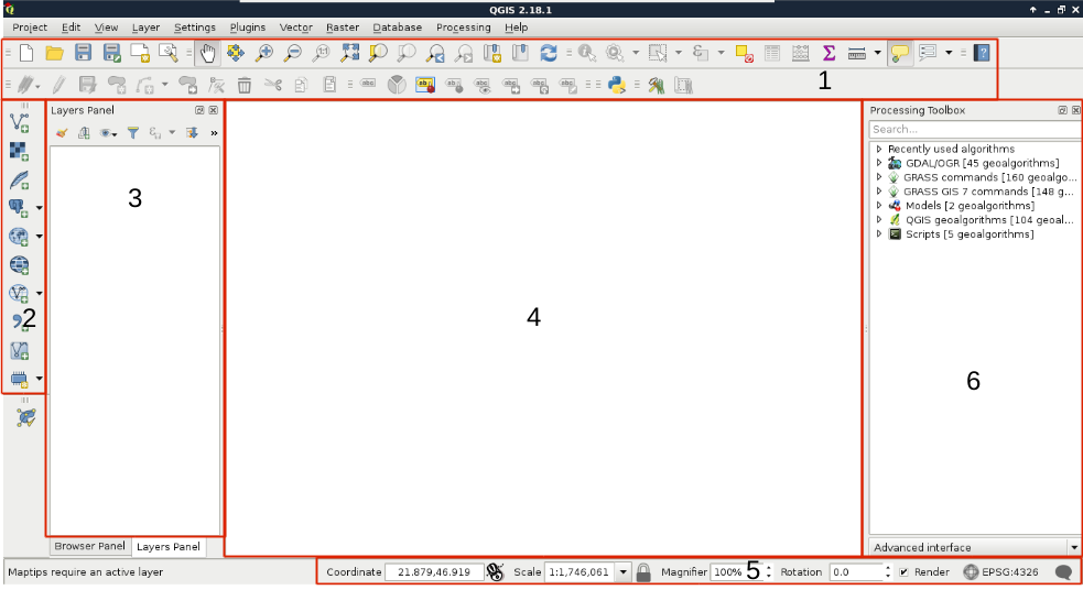 We can describe the distinct parts of the QGIS GUI as follows: