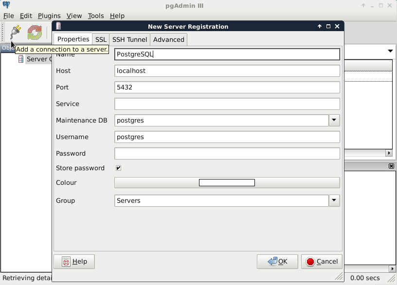The Name can be anything we would like, it only acts as a named item in the list we can choose from. The Host, the Port, and the Username, on the other hand, have to be supplied properly. As we installed PostgreSQL locally, the host is 127.0.0.1, or simply localhost. As the default install comes with the default user postgres (we will refer to users as roles in the future due to the naming conventions of PostgreSQL), we should use that.