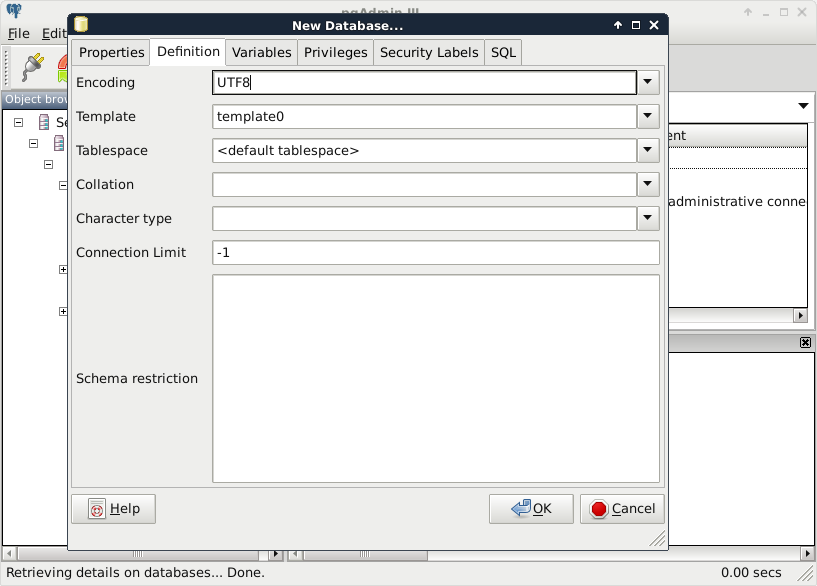 Upon connecting to the server, we can see a single database called postgres. This is the default database of the freshly installed PostgreSQL. As the next step, we create another database by right-clicking on Databases and selecting New Database. The database can be named as per our liking (I'm naming it spatial). The owner of the database should be the default postgres role in our case. The only other parameter we should define is the default character encoding of the database: