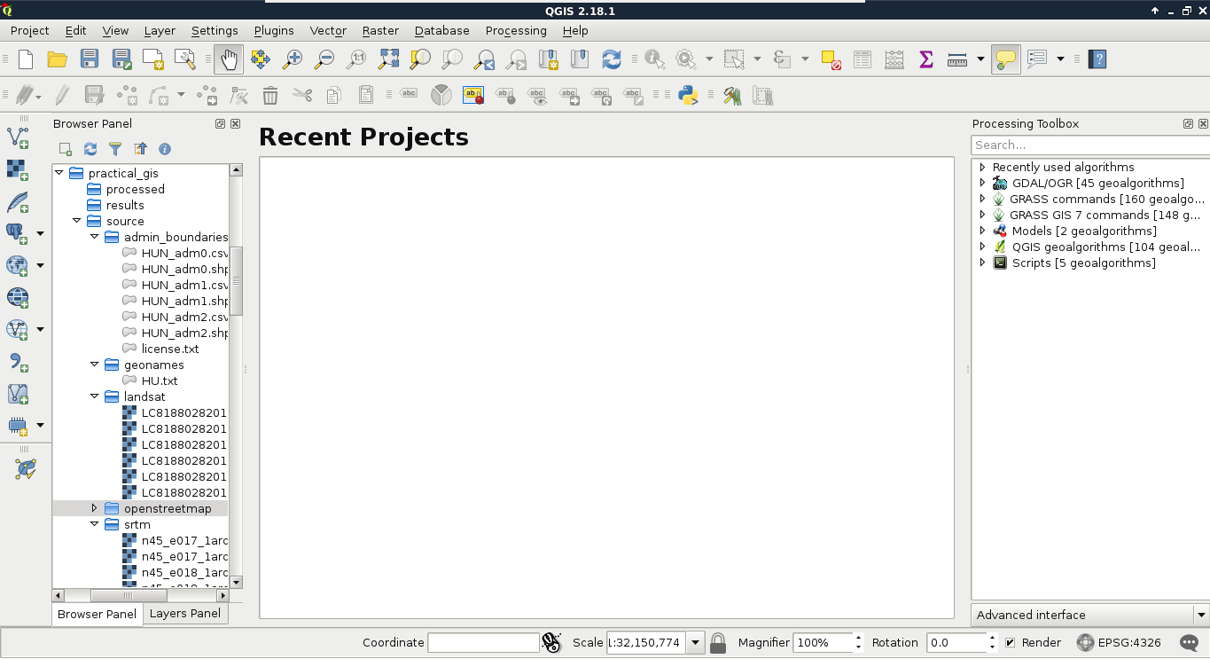 Congratulations! You're through the hardest part of this chapter. The following step is to make some initial configurations on the installed software to make them ready to use when we need them. First of all, let's open QGIS. At first glance, it has a lot of tools. However, most of them are very simple and self-explanatory. We can group the parts of the GUI as shown in the following image: