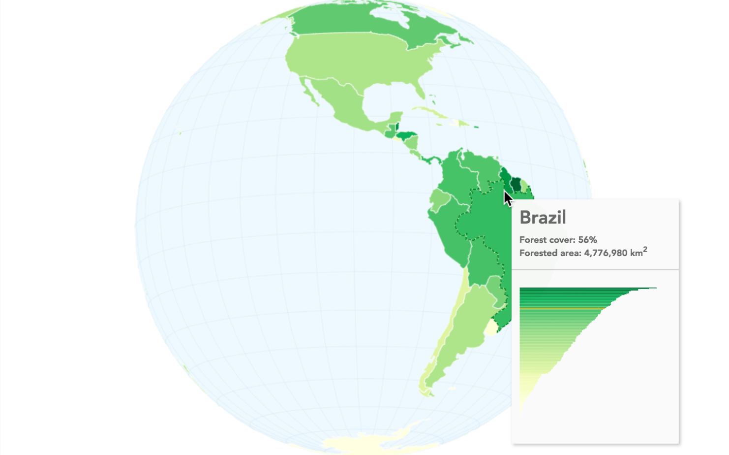 The preceding screenshot shows a globe visualization of forest cover per country. The data comes from the source of all solid wisdom, Wikipedia. The suggestion is to visualize it as a choropleth map. Arguably, choropleth maps have been overused in recent years, but they are nonetheless a great option to show percentage comparisons of geo-areas.