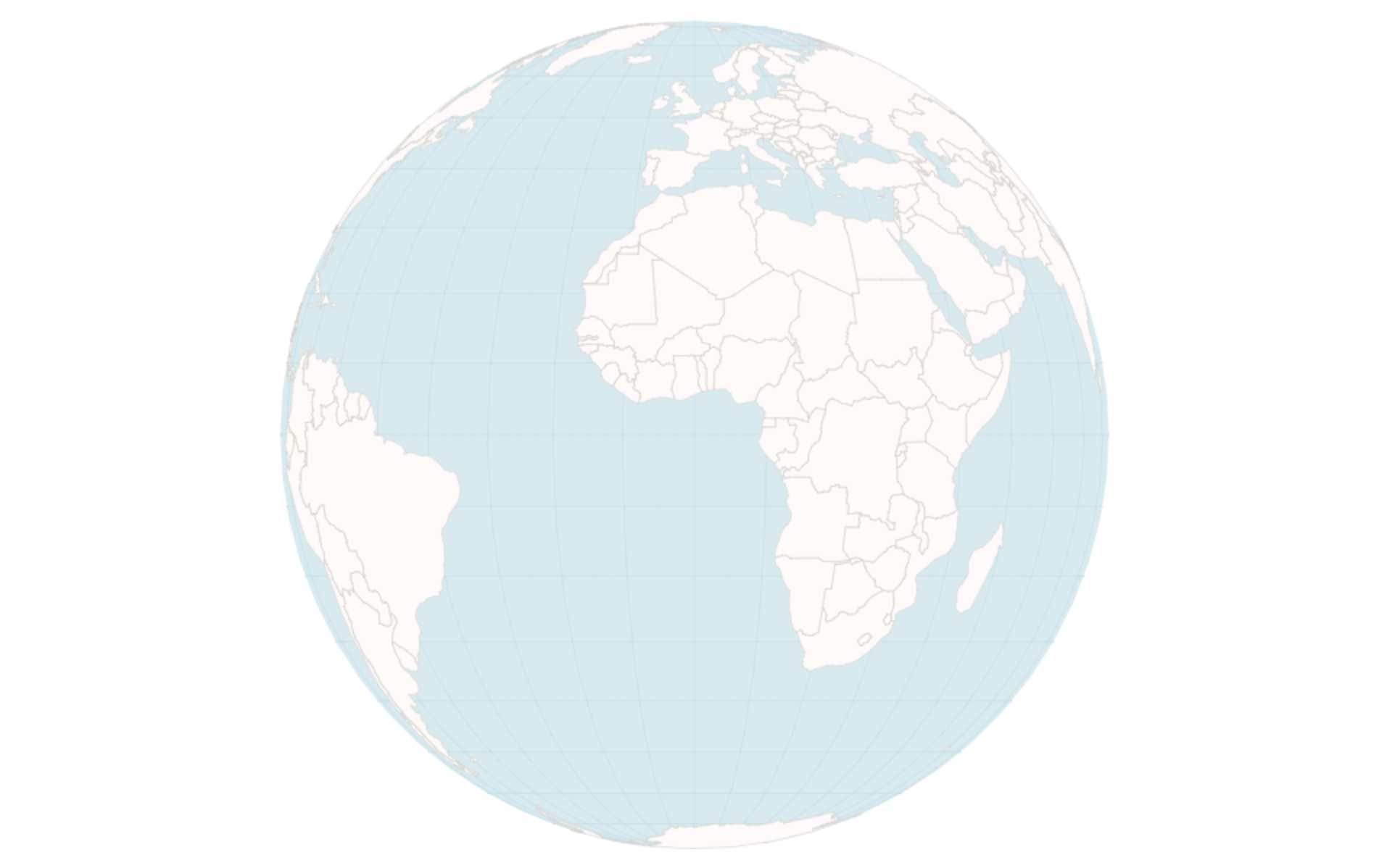 It clears the buffer context, then draws a base sphere in a light blue and a graticule grid in a slightly more saturated blue. It then fills the countries in a light gray color and strokes each country in a darker gray. That’s it. Here’s your very own Canvas globe: