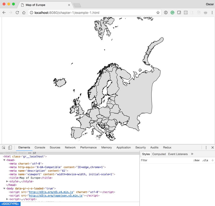 We also want to draw your attention to how the HTML5 application loads the D3 library. Again, in the Elements tag, after the SVG tag, you should see the <script> tag pointing to D3.js and TopoJSON: