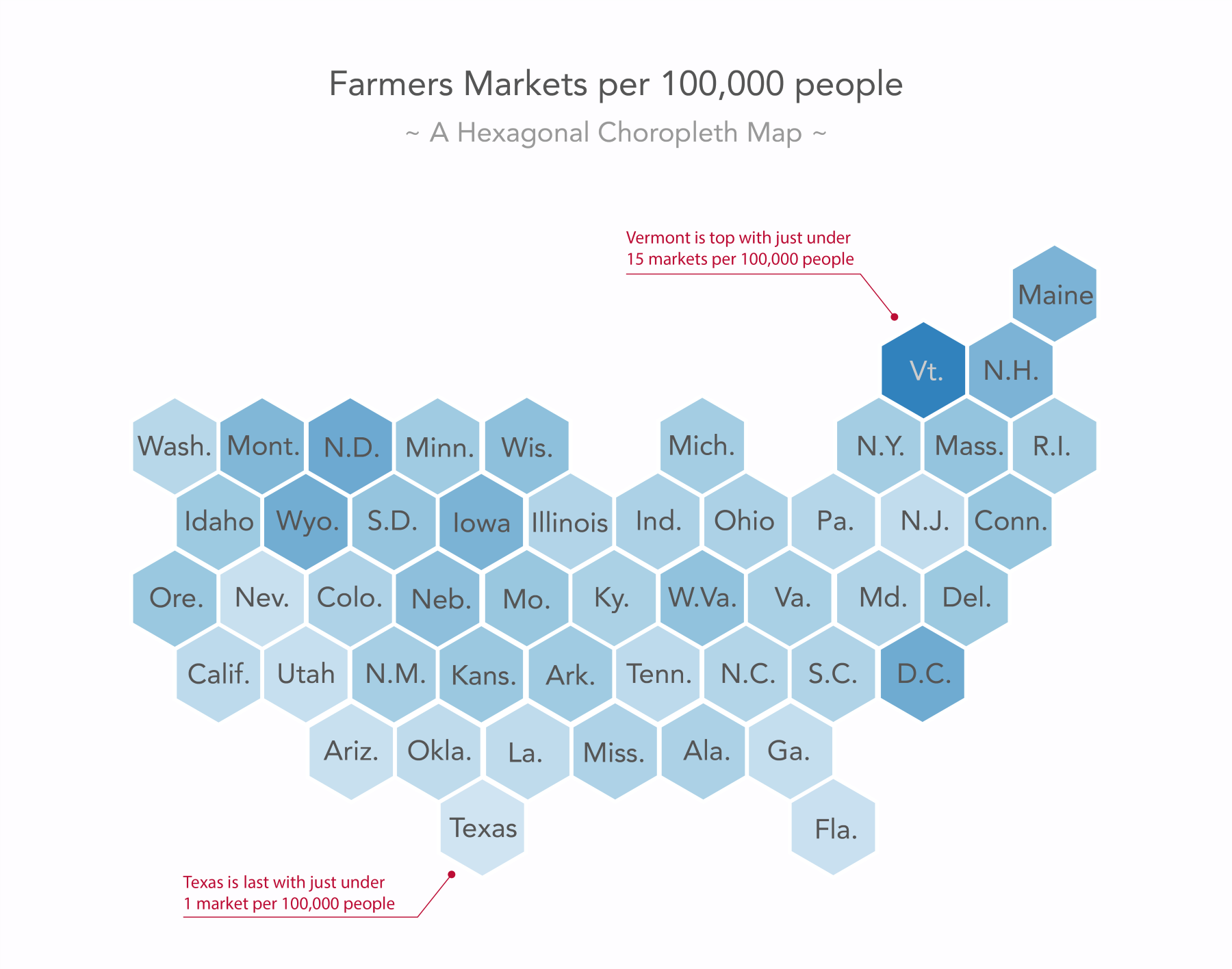 Be aware that this comes with the cost of removing the area information entirely, as the US states differ greatly in area and no state looks like a hexagon. However, unlike the preceding classic choropleth example, this hexagonal choropleth allows us, for example, to easily identify Washington D.C. as a farmers' market hub and that might be the message we want to bring across above all.