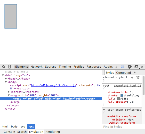 Next, we use the svg variable and append a <rect> item to it. This rect item will start at (10,10) and will have a width of 50 and a height of 100. From your Chrome browser, open the Chrome developer tools with the Elements tab selected and inspect the SVG element: