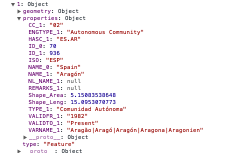 properties: This is any additional data to be attached to the feature. This is a typical name/value pair JSON object. In the preceding example, the properties attribute is leveraged to store the name of the country. This is very helpful when we need to find the country later to bind additional data to the visualization. See the following screenshot for examples of properties that can be bound to a feature object: