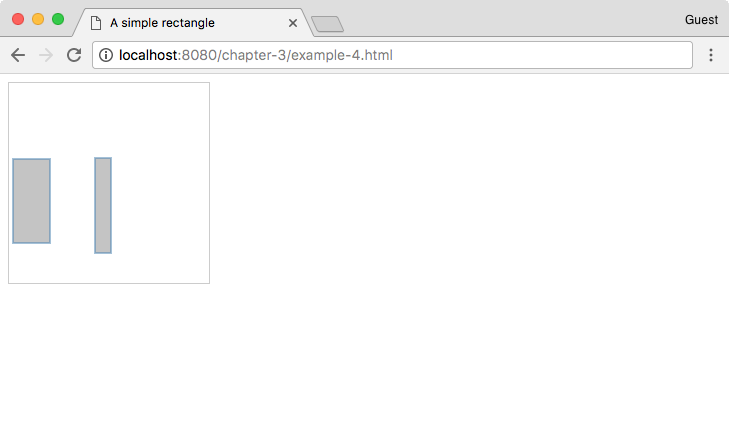 Not only do we have our rectangles, but we've also joined them to a dataset composed of two objects. Both objects share the same properties, namely x, y, width, and height, so it's easy to loop through them and read/bind the values to our visualization. The output of this is a set of static SVG elements. This section will cover how to update the SVG elements and properties as the joined data changes. Let's enhance the previous example to explain exactly how this works (http://localhost:8080/chapter-3/example-4.html):