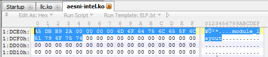 At the time, I could not find reliable information on where to obtain version numbers for certain symbols, but it may be a good workaround, which is definitely sufficient for our small LKM, to simply search for symbol names prepended with the 8-byte version value (4 bytes on 32-bit systems), as shown in the following screenshot: