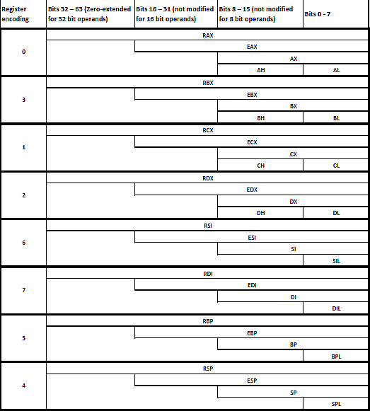 Depending on the mode of the operation (protected or long), there are 8 to 16 available general purpose registers in modern Intel processors. Each register is divided into subregisters, allowing access to data with a bit width lower than the width of the register.