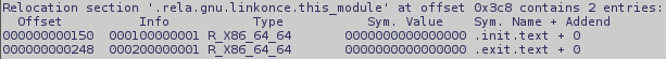readelf- sr name_of_the_mofule.koThen, we see the offsets in the output: