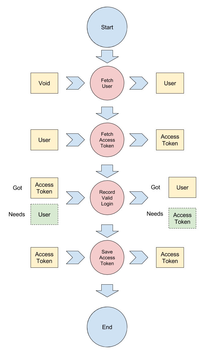We can see that we need a User object to retrieve an Access Token. However, the subsequent step again requires a User object so that it that the success of the login can be recorded. Afterward, the Access Token needs to be saved for later use. In the end, we need both of them--an Access Token and a User object to be available in the multiple subsequent operations that follow.