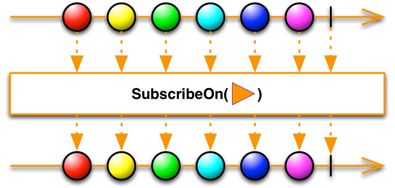 The .subscribeOn() operator changes the scheduler where the Observer will start the execution, while the .observeOn() operator changes the scheduler where the actions will be executed after it is applied. The following .subscribeOn() action shows how it changed the scheduler for the entire Observable from the default one to the orange one; we can see this because the color of Observable lines and the color of dotted emission lines changed to orange: