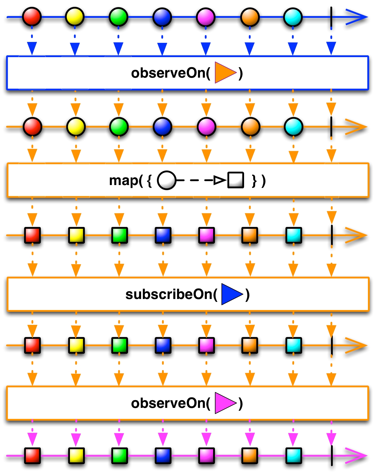 Finally, the last .observeOn() call changed the scheduler again for the subsequent operations from the orange scheduler to the purple scheduler.