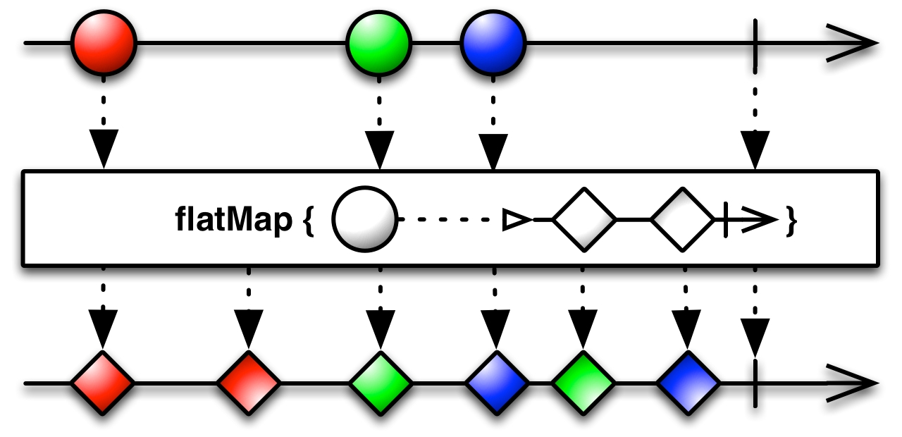 As we can see in the preceding figure, in the resulting Observable, each of the items was replaced by two elements. However, it emphasizes that the order of the items can be changed, because there is a green item after a blue one.