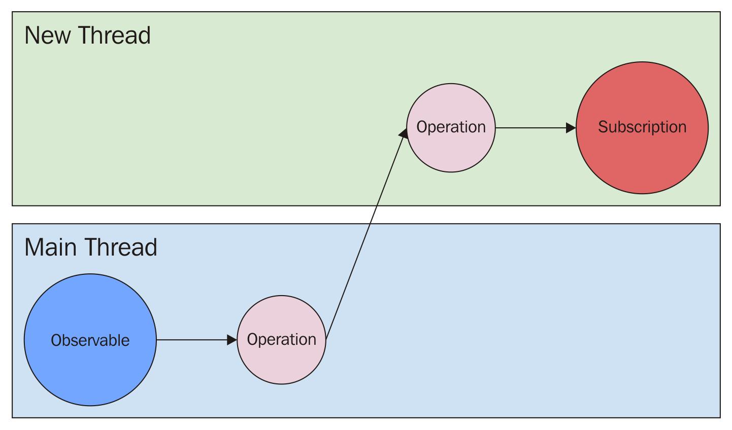 Finally, the last .observeOn() call changed the scheduler again for the subsequent operations from the orange scheduler to the purple scheduler.