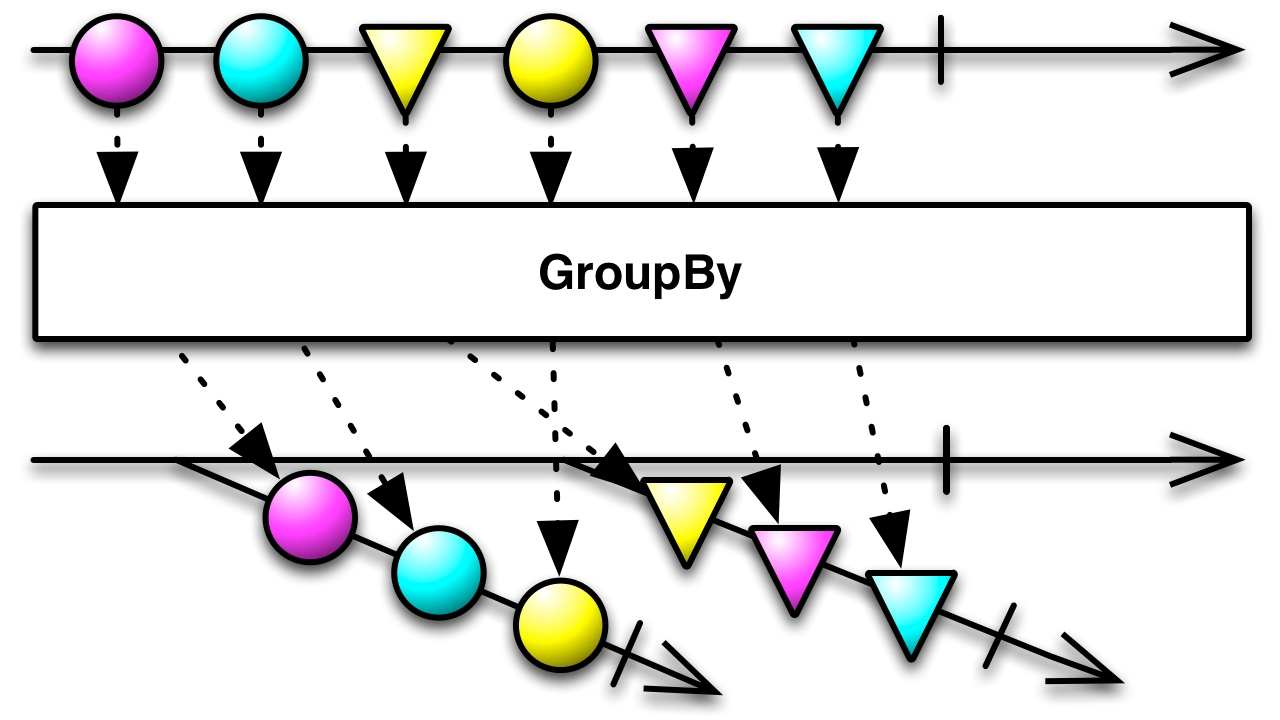 In the preceding figure, we can see that after applying .groupBy() operator, the new Observables are grouped by the shape of the original element.