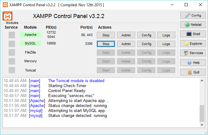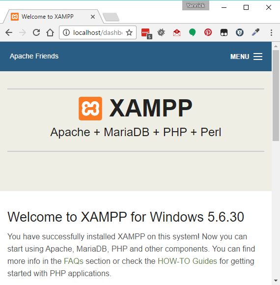 Once XAMPP is installed and started, the keyword localhost that we type in the web browser is recognized by the operating system as a request to communicate with the web server on the local computer and the Apache web server displays the welcome page from its documentation.