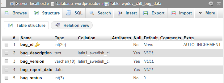 In the first few steps, the phpMyAdmin interface is used to create a database on the local MySQL server. This web-based database management tool comes bundled with XAMPP and most other web servers. The http://localhost/phpmyadmin address will always take you to the database administration tool, even if you relocate your web server's document root directory as documented in the previous recipe.