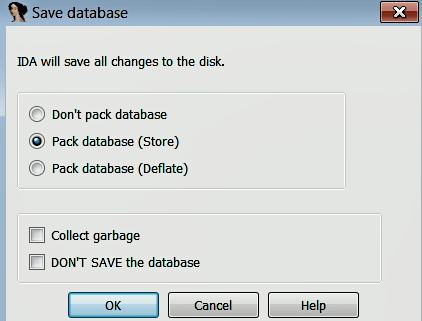 When an executable is loaded into IDA, it creates a database consisting of five files (whose extensions are .id0, .id1, .nam, .id2, and .til) in the working directory. Each of these files stores various information and has a base name that matches the selected executable. These files are archived and compressed into a database file with a .idb (for 32-bit binary) or .i64 (for 64-bit binary) extension. Upon loading the executable, the database is created and populated with the information from the executable files. The various displays that are presented to you are simply views into the database that gives information in a format that is useful for code analysis. Any modifications that you make (such as renaming, commenting, and so on) are reflected in the views and saved in the database, but these changes do not modify the original executable file. You can save the database by closing IDA; when you close IDA, you will be presented with a Save database dialog, as shown in the following screenshot. The Pack database option (the default option) archives all of the files into a single IDB (.idb) or i64 (.i64) file. When you reopen the .idb or .i64 file, you should be able to see the renamed variables and comments: