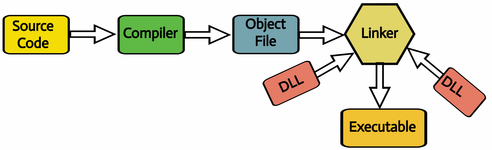 - The object code is then passed through the linker. The linker links the object code with the required libraries (DLLs) to produce an executable that can be run on a system: