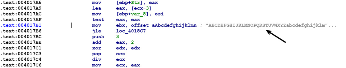 You can identify a binary using base64 encoding by looking for a long string comprising the Base64 character set (alphanumeric characters, + and /). The following screenshot shows the Base64 character set in the malicious binary, suggesting that malware probably uses Base64 encoding: