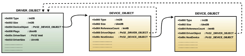 From the preceding output, you can see that the DEVICE_OBJECT contains a DriverObject field that points back to the driver object. In other words, the associated driver can be determined from the device object. This is how the I/O manager can determine the associated driver when it receives the I/O request for a specific device. This concept can be visualized using the following diagram:
