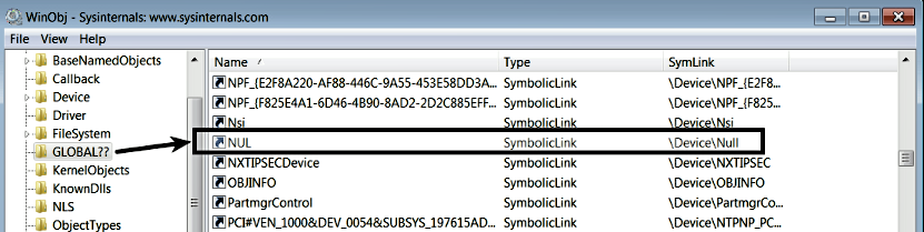 The device created under the \Device directory is not accessible to the applications running in the user mode. In other words, if a user mode application wants to perform I/O operations on the device, it cannot directly open a handle to the device by passing the name of the device (such as \Device\Null) as the argument to the CreateFile function. The CreateFile function is not just used for creating or opening a file, it can also be used to open a handle to the device. If a user mode application cannot access the device, then how can it perform I/O operations? To make the device accessible to the user mode applications, the driver needs to advertise the device. This is done by creating a symbolic link to the device. A driver can create a symbolic link using the kernel API IoCreateSymbolicLink. When a symbolic link is created for a device (such as \Device\Null), you can find it in the \GLOBAL?? directory in the object manager namespace, which can also be viewed using the WinObj tool. In the following screenshot, you can see that NUL is the name of the symbolic link created for the \Device\Null device by the null.sys driver: