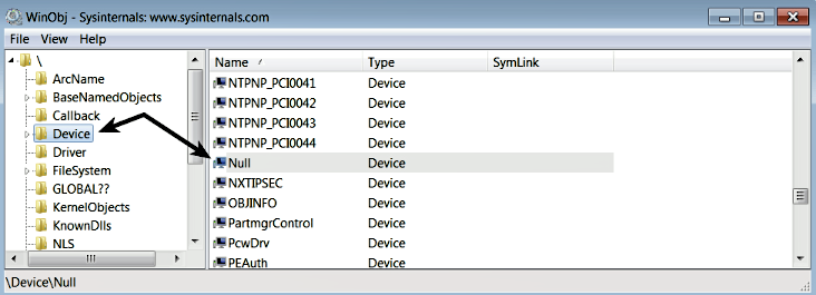 When a driver creates a device, the device objects are placed in the \Device directory in the Windows object manager's namespace. To view the object manager's namespace information, you can use the WinObj tool (https://docs.microsoft.com/en-us/sysinternals/downloads/winobj). The following screenshot shows the device (Null) created by null.sys in the \Device directory. You can also see the devices that have been created by other drivers: