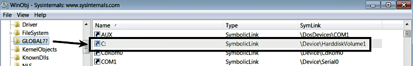 The symbolic link is also referred to as an MS-DOS device name. A user mode application can simply use the name of the symbolic link (MS-DOS device name) to open the handle to the device using the convention \\.\<symboliclink name>. For example, to open a handle to \Device\Null, a user mode application has to just pass \\.\NUL as the first argument (lpFilename) to the CreateFile function, which returns the file handle to the device. To be specific, anything that is a symbolic link within the object manager's directory GLOBAL?? can be opened using the CreateFile function. As shown in the following screenshot, the C: volume is just a symbolic link to \Device\HarddiskVolume1. In Windows, I/O operations are performed on virtual files. In other words, devices, directories, pipes, and files are all treated as virtual files (that can be opened using the CreateFile function):