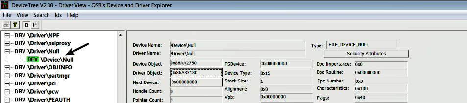 Since null.sys is already loaded, its driver object (DRIVER_OBJECT structure) will be populated with metadata information during the driver initialization. Let's look at its driver object to understand what kind of information it contains. You can display the driver object information using the !drvobj extension command. From the following output, the driver object representing null.sys is at address 86a33180. The value 86aa2750 below Device Object list is the pointer to the device object created by null.sys. If the driver creates multiple devices, you will see multiple entries under the Device Object list: