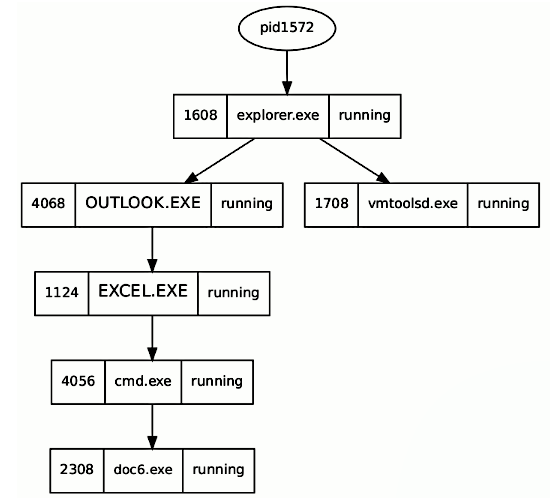 When examining processes, it can be useful to determine the parent/child relationships between the processes. During malware investigation, this will help you understand which other processes are related to the malicious process. The pstree plugin displays the parent-child process relationships by using the output from the pslist and formatting it in a tree view. In the following example, running the pstree plugin against an infected memory image displays a process relationship; a child process is indented to the right and prepended with periods. From the output, you can see that OUTLOOK.EXE was started by the explorer.exe process. This is normal because whenever you launch an application by double-clicking, it is the explorer that launches the application. OUTLOOK.EXE (pid 4068) launched EXCEL.EXE (pid 1124), which in turn invoked cmd.exe (pid 4056) to execute the malware process doc6.exe (pid 2308). By looking at the events, you can assume that the user opened a malicious Excel document sent via email, which probably exploited a vulnerability or executed a macro code to drop the malware and executed it via cmd.exe: