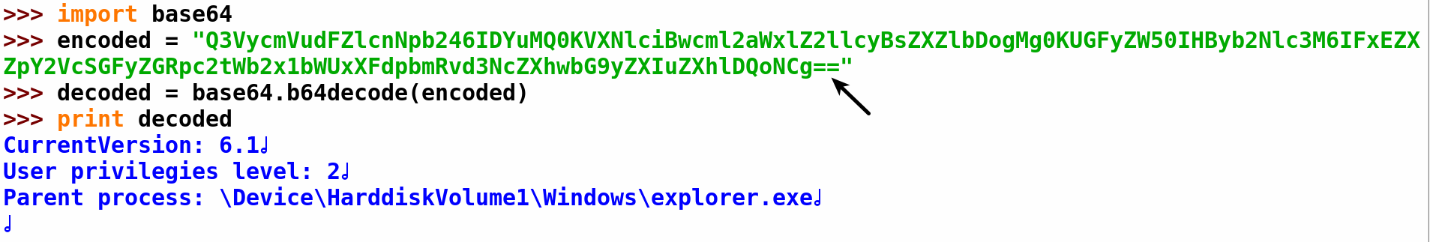 >>> encoded = "Q3VycmVudFZlcnNpb246IDYuMQ0KVXNlciBwcml2aWxlZ2llcyBsZXZlbDogMg0KUGFyZW50IHByb2Nlc3M6IFxEZXZpY2VcSGFyZGRpc2tWb2x1bWUxXFdpbmRvd3NcZXhwbG9yZXIuZXhlDQoNCg"