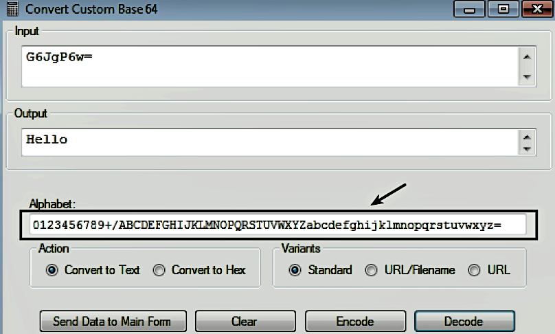 You can also perform custom Base64 decoding using the ConverterNET tool by selecting Conversions | Convert Custom Base64. Just enter the custom Base64 character set in the Alphabet field, and then enter the data to decode in the Input field and press the Decode button, as shown here: