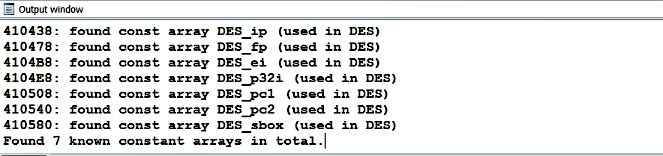 Findcrypt2 (http://www.hexblog.com/ida_pro/files/findcrypt2.zip) is an IDA Pro plug-in that searches for cryptographic constants used by many different algorithms in memory. To use the plugin, download it, and copy theĀ findcrypt.plw file into the IDA plugins folder. Now, when you load the binary, the plugin is automatically run, or you can manually invoke it by selecting Edit | Plugins | Find crypt v2. The results of the plugin are displayed in the output window:
