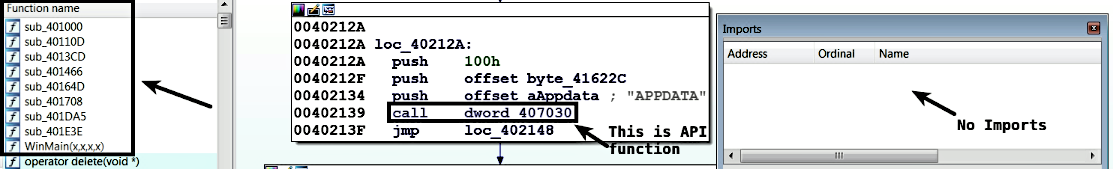 Now, when you load the dumped executable into IDA, you will see the entire list of built-in functions (which was not visible in the packed program before), and the function code is no longer obfuscated, but still, the imports are not visible, and the API call displays addresses instead of names. To overcome this problem, you need to rebuild the import table of the packed binary:
