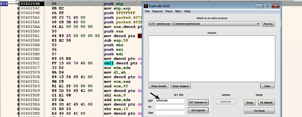 Now that we have located the OEP, the next step is to dump the process memory to disk. To dump the process, we will use a tool named Scylla (https://github.com/NtQuery/Scylla); it is a great tool to dump the process memory and to rebuild the import address table. One of the great features of x64dbg is that it integrates Scylla, and Scylla can be launched by clicking on Plugins | Scylla, (or Ctrl + I). To dump the process memory, while the execution is paused at the OEP, launch Scylla, make sure that the OEP field is set to correct address as follows; if not you need to set it manually and click on the Dump button and save the dumped executable to disk (in this case, it was saved as packed_dump.exe):