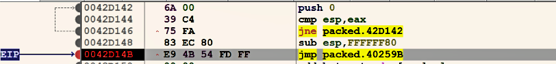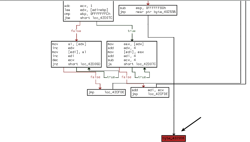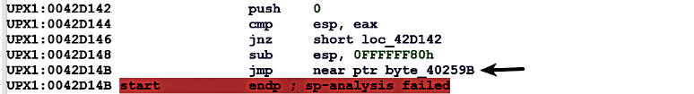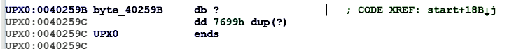 Double-clicking on the jump destination (byte_40259B) shows that the jump will be taken to UPX0 (from UPX1). In other words, upon execution, the malware executes decompression stub in UPX1, which unpacks the original binary, copies unpacked code in UPX0, and the jump instruction will most likely transfer the control to the unpacked code in UPX0 (from UPX1).