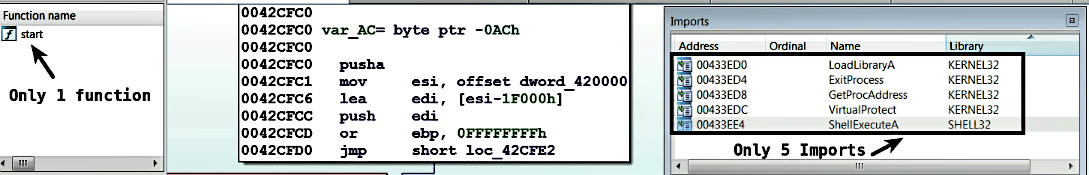 The binary consists of only one built-in function and only 5 imported functions; all these indicators suggest that the binary is packed: