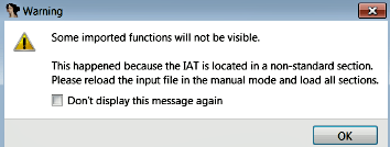 Another indicator is that the packed binary contains obfuscated strings, and when you load the binary in IDA, IDA recognizes that the import address table (IAT) is in a nonstandard location and displays the following warning; this is due to UPX packing all the sections and IAT: