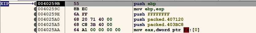 You can now assume that the malware has finished unpacking; now, you can press F7 once (step into), which takes you to the original entry point at address 0x0040259B. At this point, we are at the malware's first instruction (after unpacking):