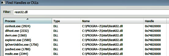 As a result of adding the preceding registry entries, when any new process (that loads User32.dll) is started, it loads the malicious DLL (ResN32.dll) into its address space. The following screenshot displays the operating system's processes that loaded the malicious DLL (ResN32.dll) after rebooting the system. Since most of these processes run with high integrity levels, it allows an adversary to execute malicious code with elevated privileges: