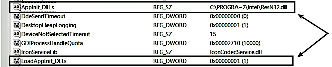 The following screenshot shows the AppInit DLL entries added by the T9000 backdoor (https://researchcenter.paloaltonetworks.com/2016/02/t9000-advanced-modular-backdoor-uses-complex-anti-analysis-techniques/):
