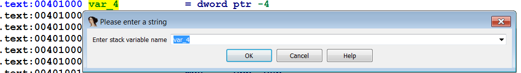 So far, we have seen how IDA performs analysis on our program and how it adds dummy names. The dummy names are useful, but these names do not tell the purpose of a variable. When analyzing malware, you should change the variable/function names to more meaningful names. To rename a variable or an argument, right-click on the variable name or argument and select rename (or press N); this will bring up the following dialog. After you rename it, IDA will propagate the new name to wherever that item is referenced. You can use the rename feature to give meaningful names to the functions, and variables: