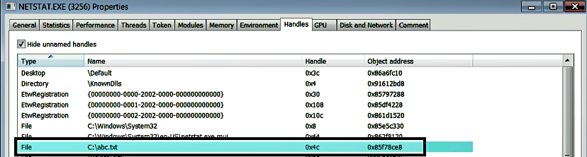 This concept is better understood with an example, so let's trigger a write operation to c:\abc.txt using the following command. When this command is executed, netstat will open the handle to abc.txt and write to it: