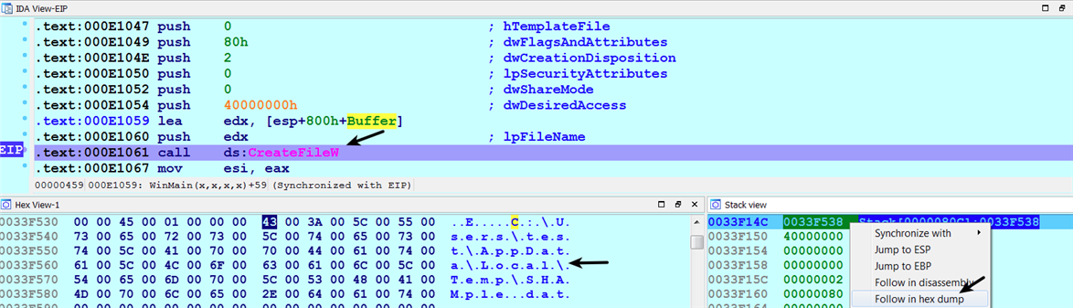 In the following screenshot, the execution is paused at the call to the CreateFileW (as a result of setting the breakpoint and running the program). The first parameter to the function is the address (0x003F538) of the UNICODE string (filename). You can use the Hex-View window in IDA to inspect the contents of any valid memory location. Dumping the contents of the first argument, by right-clicking on the address 0x003F538 and choosing the Follow in hex dump option, displays the filename in the Hex-View window, shown as follows. In this case, the malware is creating a file, SHAMple.dat, in the C:\Users\test\AppData\Local\Temp directory: