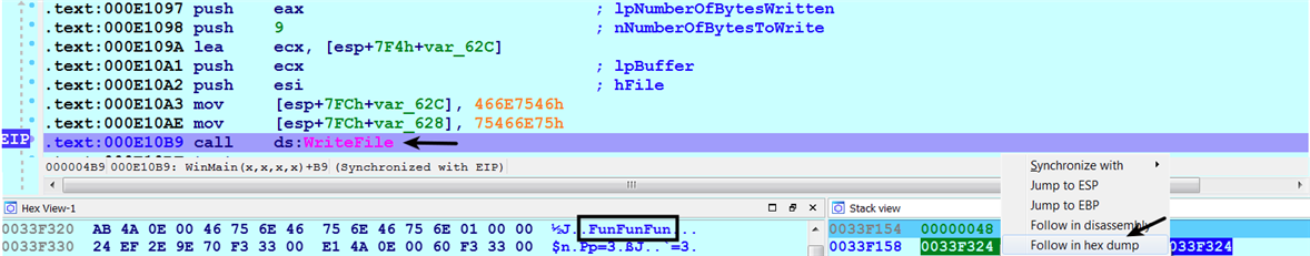 The malware, after creating the file, passes the file handle as the first argument to the WriteFile function. This indicates that the malware writes some content to the file SHAmple.dat. To determine what content it writes to the file, you can inspect the second argument to the WriteFile function. In this case, it is writing the string FunFunFun to the file, as shown in the following screenshot. If the malware is writing executable content to the file, you will also be able to see it using this method: