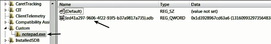 The following screenshot shows the registry entry created in HKLM\SOFTWARE\Microsoft\Windows NT\CurrentVersion\AppCompatFlags\Custom\. This registry entry contains the name of the program for which the shim is applied, and the associated shim database file (<GUID>.sdb):